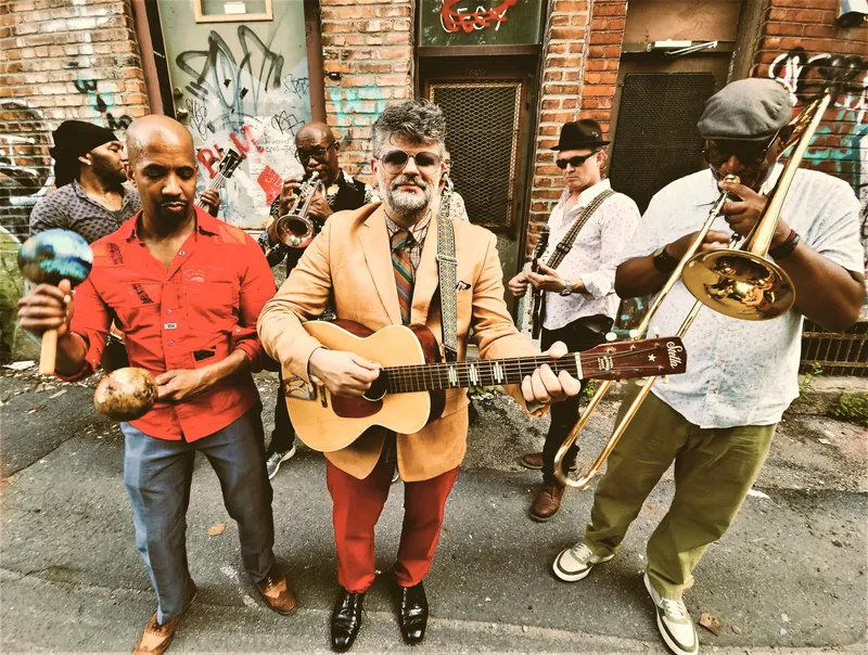 They’ve been lauded as an intoxicating blend of lilting calypsonian wit, dancehall reggae and trombone-heavy brass and a unique, transnational composite of rhythm, poetry and activist journalism. Behind the running social commentary and satire, Drew journals the human condition – our quirks and foibles, anxieties and hopes, and the haunting sense of impermanence that imbues life. The title track to their 2022 album Carnival of the Ghosts exemplifies Drew’s innovative take on calypso’s celebration of satire, humour, storytelling and social commentary: it’s about a spectator watching the parade who is put under a spell from a spirit, transporting him in to a surreal and dark version of the carnival, populated by ghosts and skeletons. It’s a spell your head, heart and soul will fall under when you witness the magic that is Kobo Town.